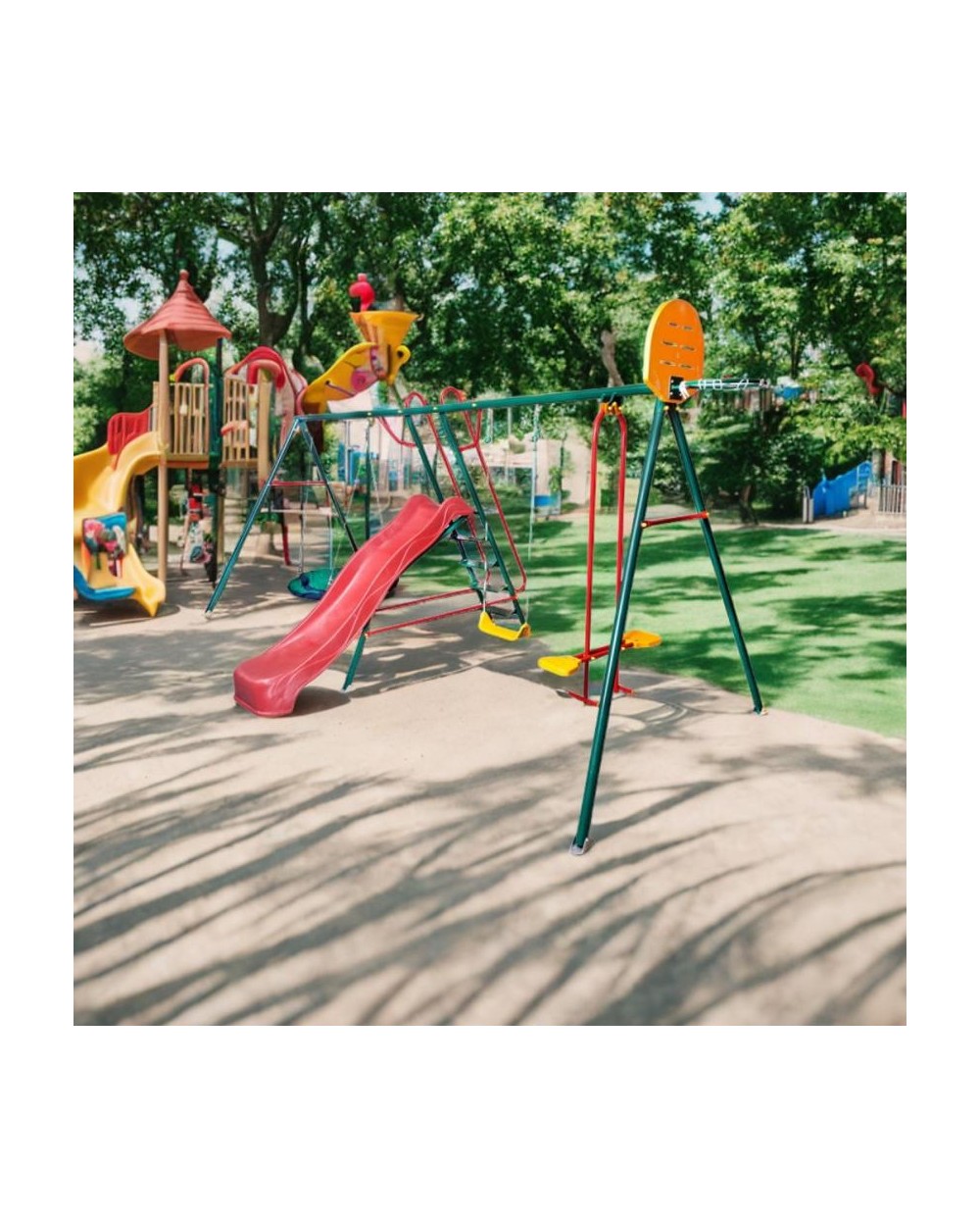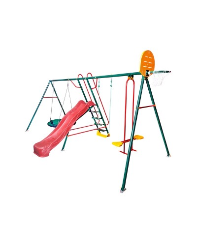 Уличный игровой комплекс "Солнышко-6" - новинка 2019 года! Это единственная модель, которая имеет в своем комплекте 4 вида качелей: качели для самым маленьких с ограничителем для ножек и высокой спинкой, качели-сиденье, парные качели и качели-гнездо, на которых может разместиться как несколько детей, так и взрослый. Так же хотим отметить и лесенку для подъема на горку - ступени у нее плоски и широкие (а не круглые трубки как раньше) с противоскользящим покрытием. Кроме того, вместе с ростом вашего ребенка, всегда есть возможность заменить подвесные качели трапецией, веревочной лестницей, канатом, гимнастическими кольцами и т.д.